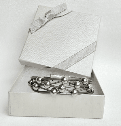 The gray cords have a slight sheen. Smooth round silver beads are crisscrossed throughout the bracelet. This creates a pattern that draws the eye to the wrist. A matching magnetic clasp secures each end. My bracelets will fit perfectly so that they will mold to your wrist’s oval shape. This prevents the bracelet from sliding around as you move.